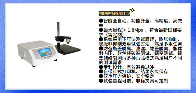密封試驗(yàn)儀 又可稱(chēng)為包裝泄漏檢測(cè)儀、密封性檢測(cè)儀。設(shè)備專(zhuān)業(yè)適用于食品、制藥、醫(yī)療器械、日化、汽車(chē)、電子元器件、文具等行業(yè)的包裝袋、瓶、管、罐、盒等的密封試驗(yàn)。亦可進(jìn)行經(jīng)跌